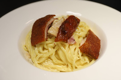 主角「乳豬卡邦尼意粉」緊接送上。這中西合璧的意粉雖然只得三件乳豬,我覺得份量少了點,而且乳豬皮也不夠脆,不過意粉味道和口感可還是不錯的,肥瘦比例適中的乳豬件蘸以另上的乳豬醬,也算好吃。
