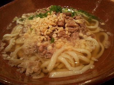 「牛肉烏冬」較為普通,湯味尚佳,炸過的脆粒混和在烏冬中,與薄切的牛肉一起為這簡單的烏冬增多點美味。