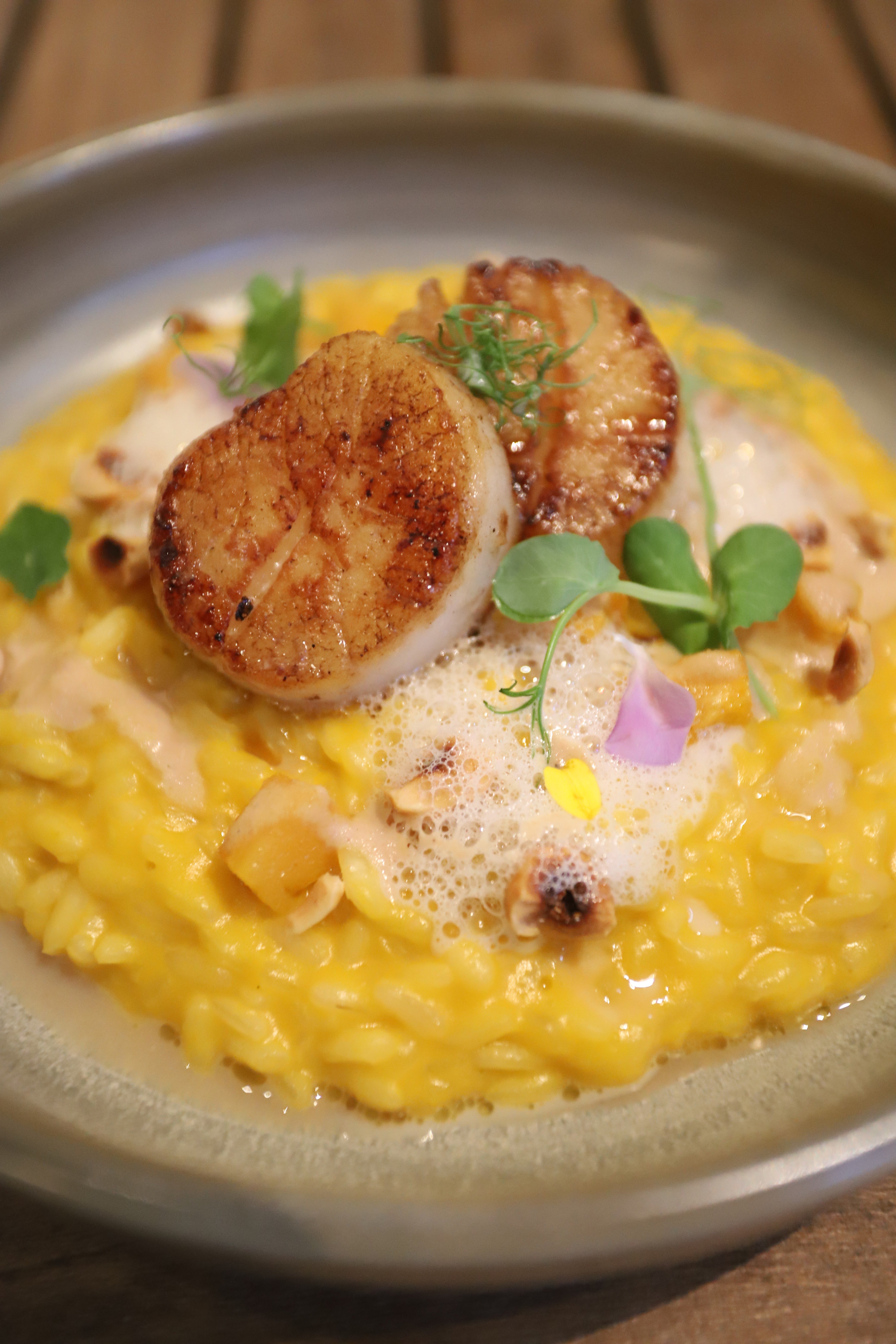 「南瓜意大利飯配香煎帶子,榛子汁,烤榛子,帶子泡」的醬汁味道相當不錯,帶子雖然只得兩隻,但煎得甚好,也夠大隻,神來之筆是以香脆的烤榛子與榛子搭配,為這顏色漂亮悅目的意大利飯帶來更豐富的口感。